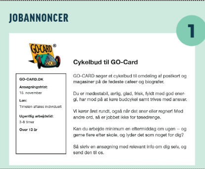 Vi skal nu se på et jobopslag til et fritidsjob for en ung under 18 år. Og vi skal se på et første udkast til en jobansøgning, som Karen i 7. klasse har skrevet.
